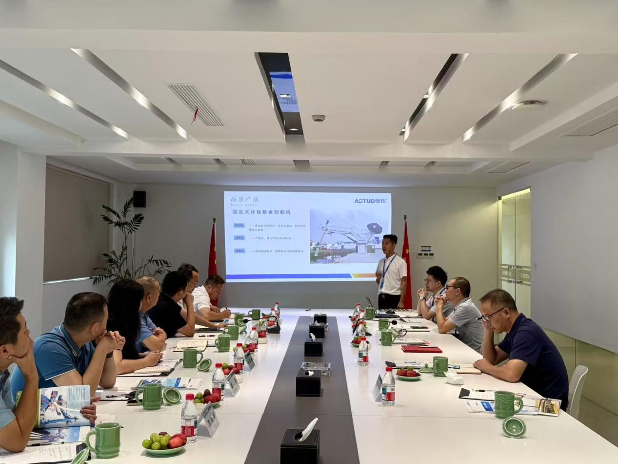 Nyligen ledde Yang Libin, medlem av partikommittén och biträdande chef för Guizhou Port and Shipping Group, en delegation för en djupgående inspektion och tekniskt utbyte. Jigui Bo, ordförande och ordförande för AOTUO, tillsammans med det tekniska kärnteamet, var värd för delegationen under hela besöket. De två parterna engagerade sig i omfattande diskussioner om ämnen som utrustning för hantering av bulklaster, processer, hamndigitalisering och smarta logistiklösningar.